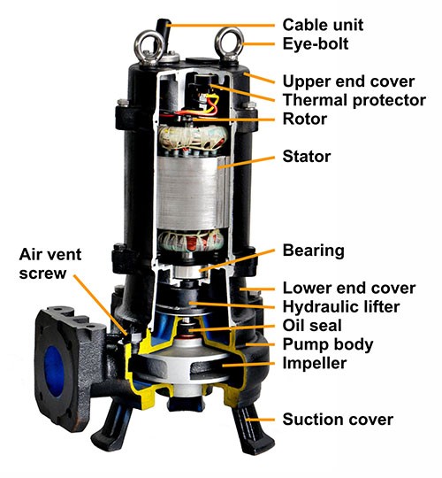 The WQ pump consist of two parts: a submersible sealed electric motor and a pump part. These two parts are seeparated by an oil chamber with a system of two end seals. The oil chamber has an opening for monitoring the oil level and replenishing if necessary. Lubrication of the upper end seal is provided by a special design of the oil filter.